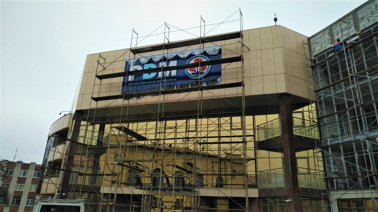 Billboardul cu logo-ul PDM a fost instalat zilele acestea, după ce la începutul lui 2017 clădirea a fost vândută de către comuniști. Din imagine se vede că încă au loc lucrări de revonare a fațadei, precum și schimbarea pavajului din curtea clădirii.