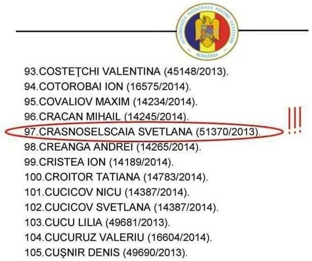 Svetlana Crasnoselscaia, soția lui Vadim Crasnoselschi, așa-numitul Președinte al Transnistriei (Republica Moldovenească Nistreană, separatistă și nerecunoscută de nimeni), deține cetățenia României.