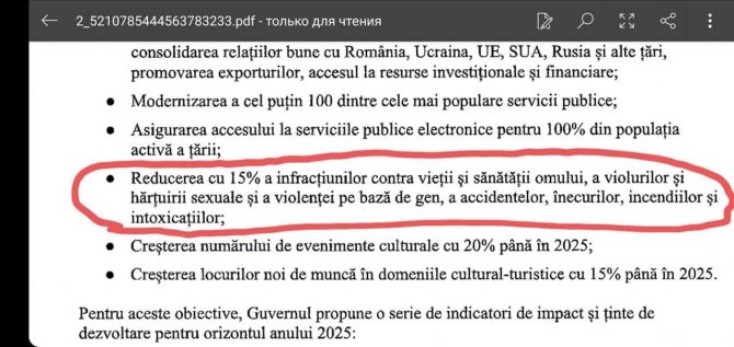 Din Programul de activitate al Guvernului Gavriliță… Acești oameni propun reducerea cu 15% a infracțiunilor contra vieții și sănătății omului și a violenței pe bază de gen. Dar cel mai interesant, dar în același timp straniu, este reducerea cu 15% a accidentelor, înecurilor, incendiilor și intoxicațiilor. Asta cum ??? Vreți să reduceți doar cu 15% iar cu restul cum rămîne? Și în general, de unde ați luat cifra de 15%, de ce nu reduceți cu 95% sau 99% ? De ce pe ceilalți îi sacrificați și îi lăsați sa fie violați, să se înece, sau sa fie intoxicați?”, se întreabă deputatul.