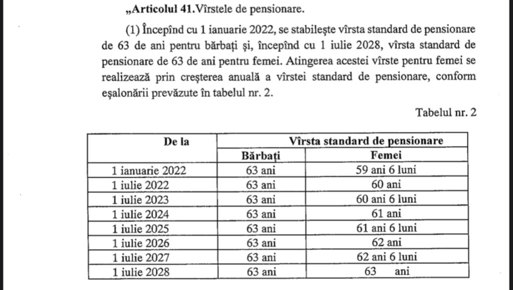 Astfel, începând cu 1 ianuarie 2022 vârsta standard de pensionare pentru bărbați va fi de 63 de ani, iar stagiul complet de cotizare de 34 de ani.