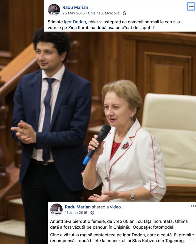 La alegerile locale din 2015, când Zinaida Greceanîi a fost candidatul PSRM pentru Primăria Chișinău, Radu Marian s-a adresat lui Dodon pe facebook în felul următor: „Stimate Igor Dodon, chiar v-așteptați ca oamenii normali la cap s-o voteze pe Zina Karabina după așa un c*cat de spot”?