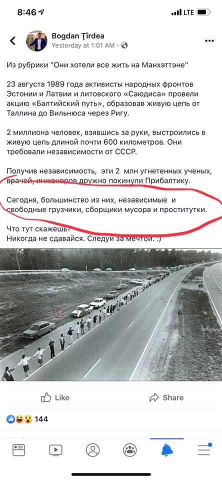 Ieri, într-o postare pe pagina sa de Facebook, deputatul socialist Bogdan Țârdea, a numit pe cei care au luptat cu ocupația sovietică în anul 1989 în țările baltice, ca fiind niște gunoieri și prostituate. Ulterior însă, Țârdea a șters această postare de pe pagina sa.