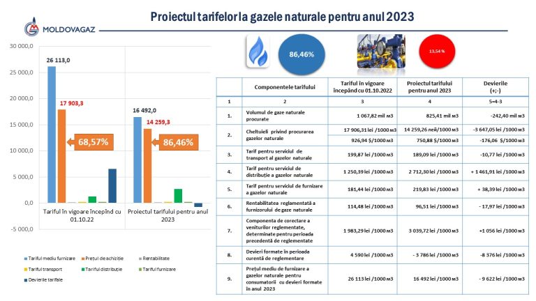 Moldovagaz a publicat structura proiectului tarifului la gazele naturale pentru anul 2023 din care reiese că devierile financiare se vor cifra la 3 647 de lei pentru fiecare mie de metri cubi de metan achiziționat, la un tarif de 14,259 de lei, scrie Bani.md