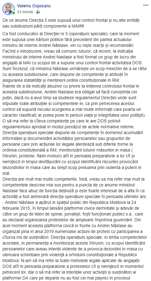 Valeriu Cojocaru explică că colaboratorii MAI din cadrul Direcției 5 au zădărnicit de mai multe ori începând cu anul 2015, planurile lui Andrei Năstase și partenerilor săi de proteste, preluarea puterii în stat prin mijloace violente și au stopat la timp dezordinile în masă puse la cale de aceeași oameni ai actualului ministru de Interne.