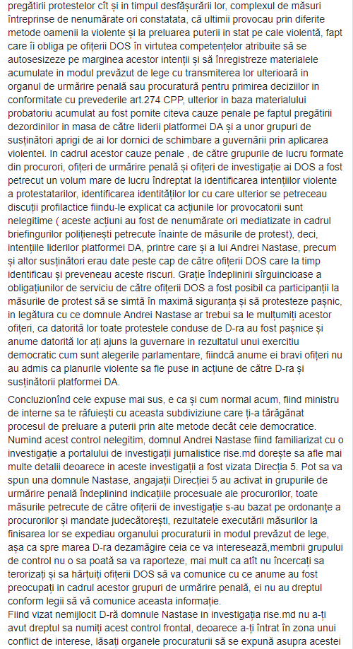 O să ma refer la câteva competențe pe care le are DOS potrivit regulamentului aprobat în modul prevăzut de actele normative interne. Direcția operațiuni speciale dispune de competențe în domeniul acumulării informației și documentării activităților persoanelor sau grupurilor de persoane care prin acțiunile lor ilegale atentează sub diferite forme la ordinea constituțională a RM, monitorizării tuturor măsurilor in masa (întruniri, proteste, flash-moburi) atât în perioada preparatorie a lor cât și nemijlocit în timpul desfășurării cu scopul identificării riscurilor provocării dezordinilor în masă care au drept scop preluarea prin violență a puterii în stat.”, se spune în mesajul fostului colaborator al MAI.