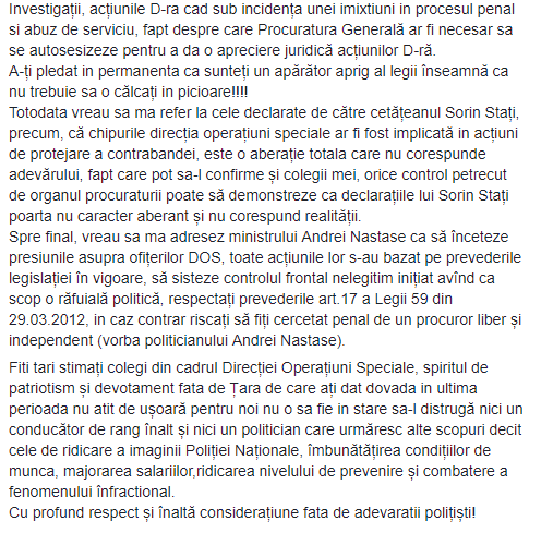 „Direcția are mult mai multe competente, însă, vreau să mă refer mai mult la competențele descrise mai sus pentru a puncta de ce anume ministrul Năstase face abuz de funcția deținută și este foarte interesat de a afla în ce activități a fost antrenată direcția operațiuni speciale în perioada ultimilor ani: