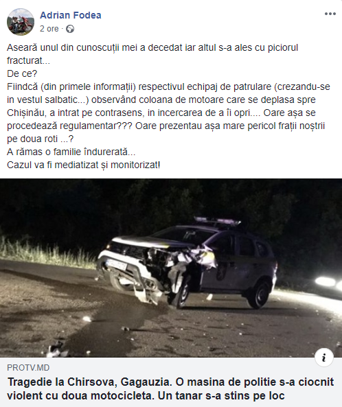De cealaltă parte, poliția a comunicat că prietenul lui Fodea, un tânăr de 28 de ani, s-a ciocnit cu automobilul poliției de model Dacia, care ar fi staționat pe carosabil, iar în urma accidentului rutier, conducatorul motocicletei a decedat la Spitalul raional Comrat.