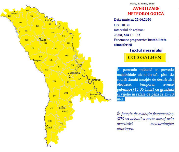 Serviciul Hidrometeorologic de Stat a emis un nou cod galben de instabilitate atmosferică pentru a doua jumătate a zilei de astăzi.