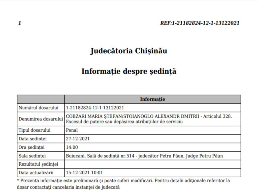 Luni, 27 decembrie 2021, ora 14:00, la Judecătoria Chișinău, sediul Buiucani va avea loc prima ședință de judecată a dosarului ”COBZARI MARIA ŞTEFAN/STOIANOGLO ALEXANDR DMITRII – Articolul 328. Excesul de putere sau depășirea atribuțiilor de serviciu”, la etapa ”pregătirea cauzei”. Dosarul a fost înregistrat pe 13 decembrie 2021, iar judecătorul desemnat este Petru Păun, informează Telegraph.md