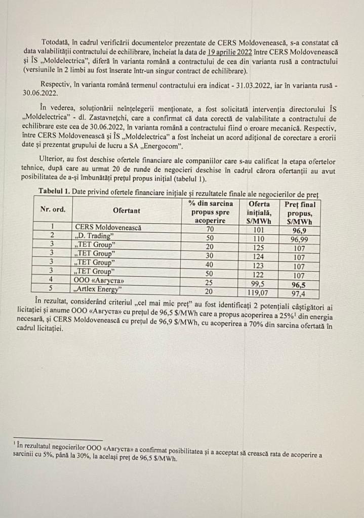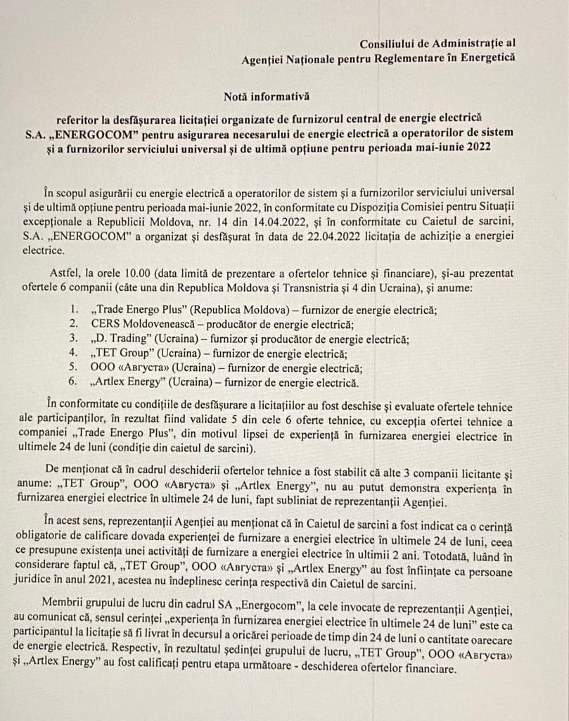 Nota informativă pentru Consiliul de Administrare ANRE. Din conținutul documentului devine clar cum reprezentanții întreprinderii Energocom au favorizat compania Августа, chiar dacă aceasta nu corespunde criteriilor din caietul de sarcini, neavănd experiența de furnizare a energiei electrice în ultimele 24 luni.