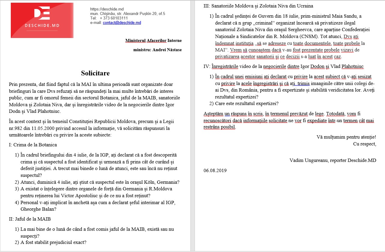 Din cauza că atât Andrei Năstase, cât și consiliera sa, Viorica Tocari, nu răspund la telefon pentru a oferi răspunsuri la întrebări ce țin de activitatea MAI, reporterii de la deschide.md au expediat, în data de 6 august, o solicitare în scris la Serviciul de presă al MAI prin care au solicitat răspunsuri la mai multe întrebări de interes public, cum ar fi omorul femeii din sectorul Botanica, jaful de la MAIB, sanatoriile Moldova și Zolotaia Niva, dar și înregistrările video de la negocierile dintre Igor Dodon și Vlad Plahotniuc.