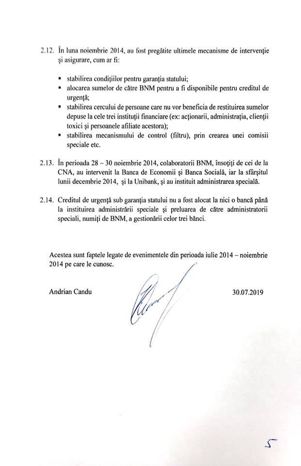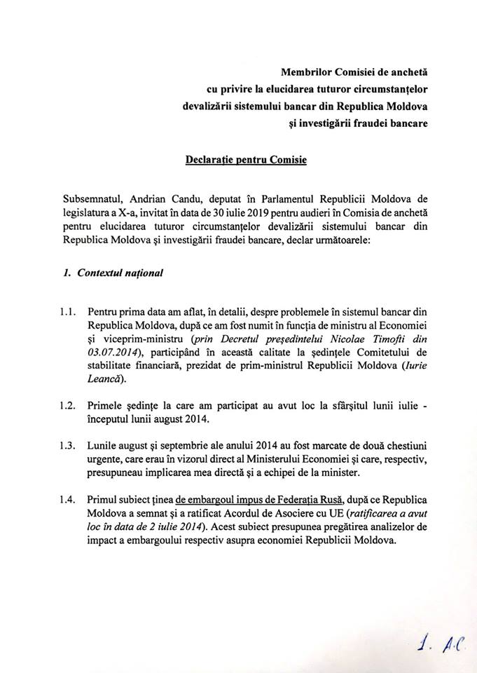 „Le-am comunicat colegilor deputați faptele pe care le cunosc în legătură cu acest subiect. Am discutat și la general despre toamna anului 2014, când, pe lângă criza din sistemul bancar, țara noastră s-a confruntat cu o criză energetică și cu consecințe grave ale embargoului rusesc la produsele moldovenești. Vreau să cunoașteți cu toții informațiile pe care le-am comunicat membrilor Comisiei, de aceea public aici declarația mea”, a scris Andrian Candu pe facebook.