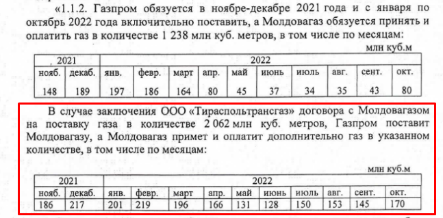Cel puțin asta reiese din document publicat, potrivit căruia, anual, până la sfârșitul lui septembrie 2026, Gazprom se obligă să livreze iar Moldovagaz se obligă să cumpere o cantitate de 3,3 miliarde metri cubi de gaze anual. Dintre acestea 1,24 miliarde urmează a fi livrate pe malul drept al Nistrului iar 2,06 miliarde urmează să ajungă la Tiraspoltransgaz. Acordul presupune că Moldovagaz se obligă să plătească livrările de gaz față de Tiraspoltransgaz.