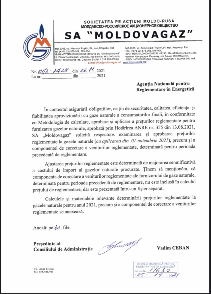 DOC // ANRE a publicat cererea Moldovagaz privind majorarea tarifelor