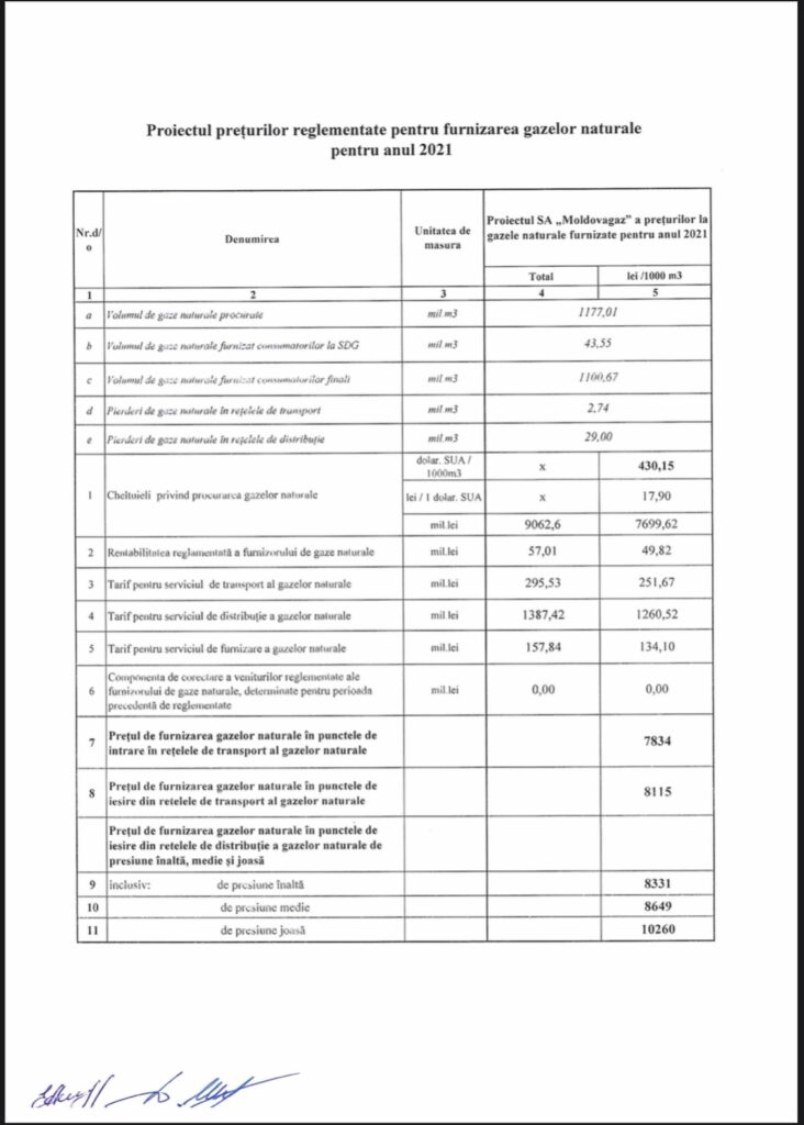 Moldovagaz cere ANRE creșterea tarifului mediu pentru furnizarea gazelor naturale consumatorilor finali la prețuri reglementate pentru anul 2021 de la 4128 la 9396 lei pentru o mie de metri cubi. Astfel, tariful la gazele naturale furnizate la punctele de ieșire din rețelele de distribuție de presiune joasă se propune să fie ridicat de la 4298 la 10260 lei pentru o mie de metri cubi, de presiune medie de la 4018 la 8649 de lei, de presiune înaltă de la 3910 la 8331 de lei pentru o mie de metri cubi.