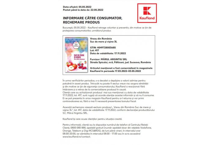 Potrivit ANSA, operatorul din domeniul alimentar Kaufland SRL a inițiat procedura de retragere din rețeaua de comerț și rechemare de la clienți a produsului „Vreau din Romania Suc de mere și vișine 3L”. Acest lot s-a regăsit doar în magazinul Kaufland Orhei.