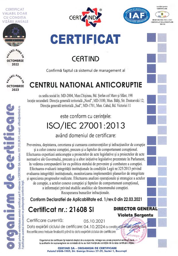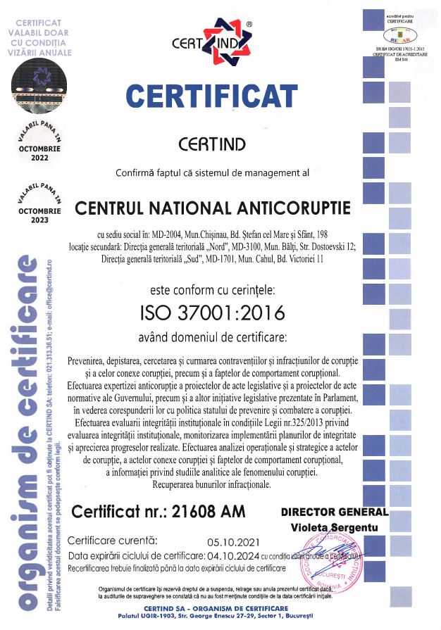 Centrul Național Anticorupție a devenit prima agenție națională anticorupție care a obținut certificatul internațional anti-mită ISO 37001 și certificatul internațional de securitate a informației ISO 27001. Aceste două documente confirmă buna funcționare a instituției și corespunderea activității acesteia cu standardele internaționale.