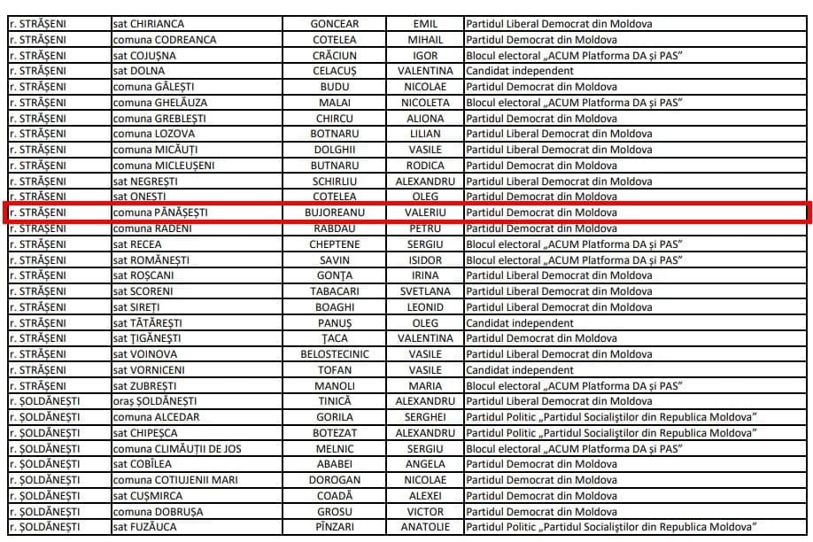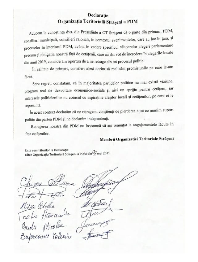 Amintim că cinci primari ai Partidului Democrat din Moldova din raionul Strășeni au anunțat că părăsesc partidul, declarându-se independenți. Este vorba de primarii din următoarele localități Greblești – Aliona Chircu; Rădeni – Petru Răbdău; Codreanca – Mihai Cotelea; Gălești – Budu Nicolae; Pănășești – Valeriu Bujoreanu și a consilierului raional – Alexandru Trohin.