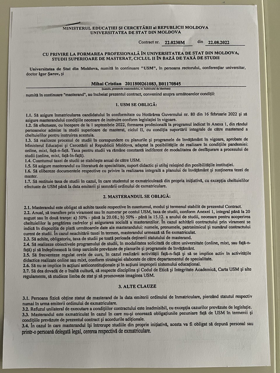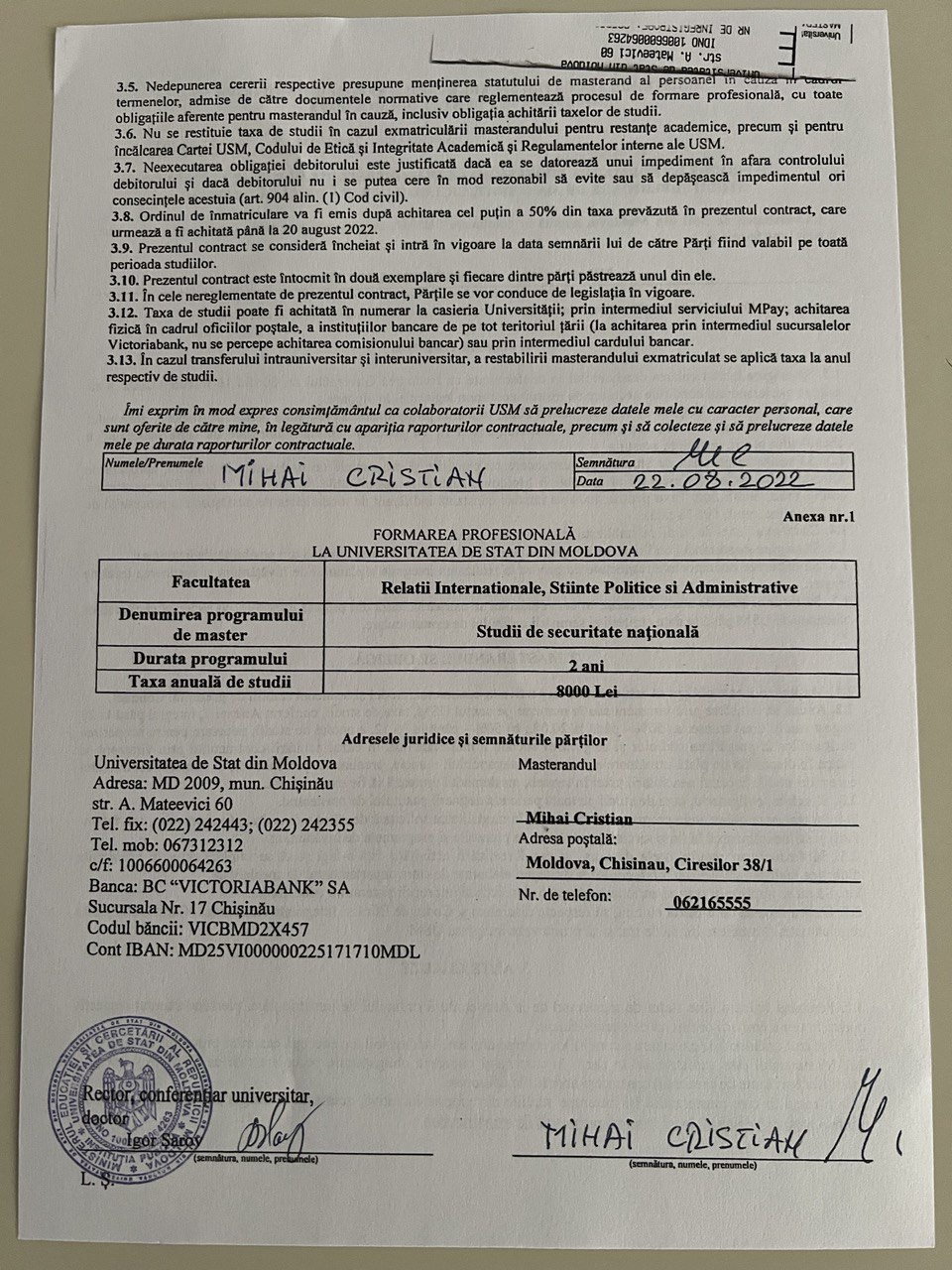 Mihai Cristian a fost admis la programul de master al SIS-lui în urma concursului de admitere, care s-a desfășurat în luna iulie. Ulterior, în august, a semnat cu USM contractul de studii (anexat mai jos). Pe 12 septembrie, politicianul e fost prezent la primele cursuri. În tot acest răstimp, nimeni nu a pus la îndoială valabilitatea buletinului de identitate moldovenesc deținut de Mihai Cristian. Pe 13 septembrie însă, peste noapte, rectorul USM, Igor Șarov, a semnat ordinul abuziv. Despre aceasta a anunțat Mihai Cristian într-o intervenție LIVE pe YouTube și Facebook.