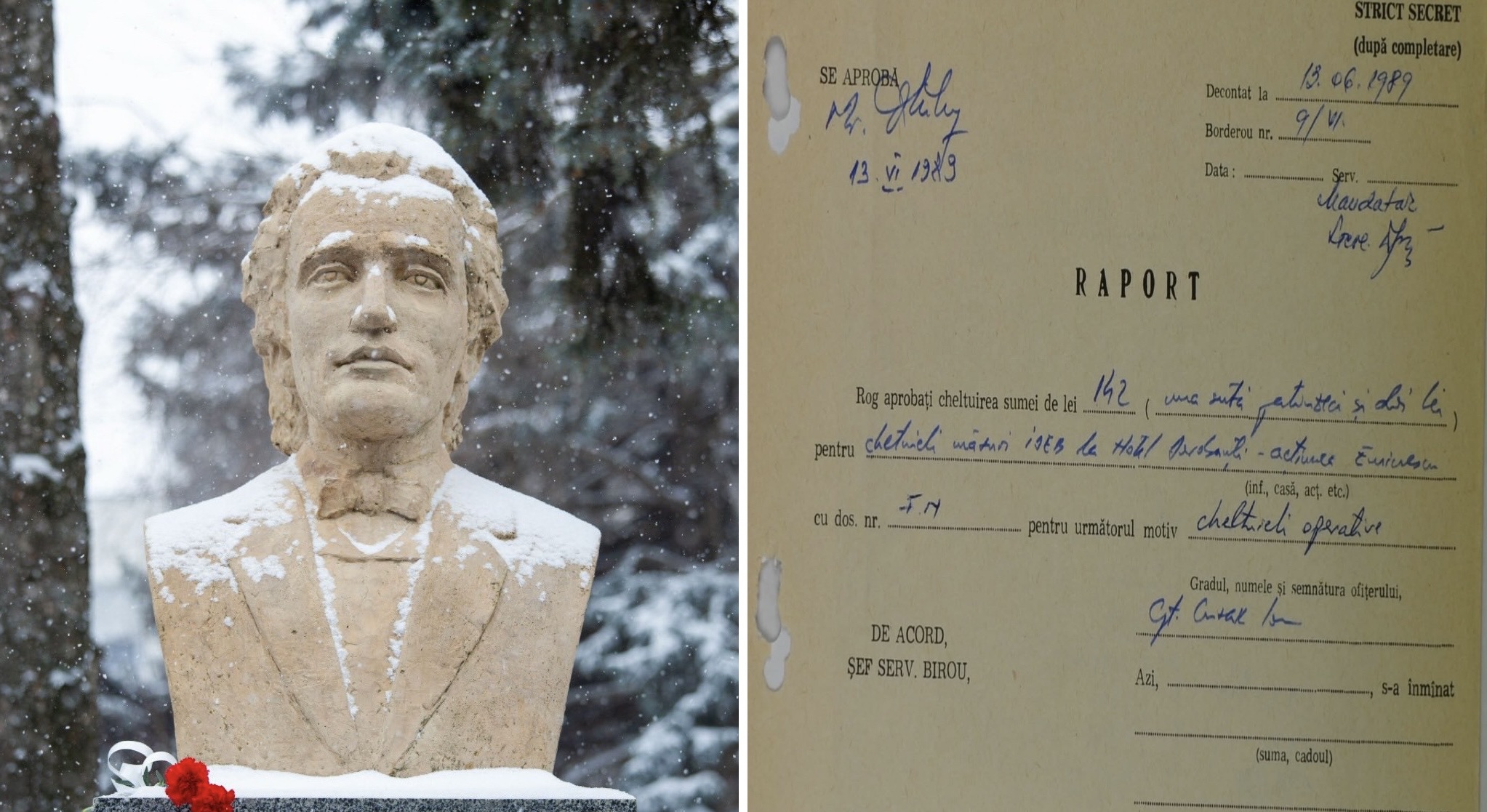 Notă: suma de 142 de lei menționată în documentul intitulat Raport (f. 64) din 13.06.1989 reprezentând ”cheltuieli măsuri IDEB la Hotel Dorobanți – acțiunea Eminescu” reprezintă decontul notei de plată (vezi f. 65) pentru consumația făcută de doi ofițeri de Securitate la restaurantul hotelului Dorobanți din Iași: 2 porții de mușchi de vacă, 2 salate, 4 chifle, 1 brifcor, 2 [sticle de] apă.