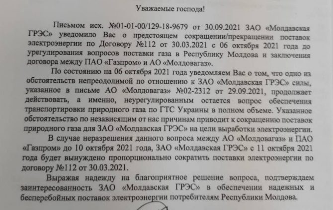 Potrivit actului, pentru că la data de 29 septembrie Republica Moldova nu a prelungit un contract de livrare a gazelor cu Gazprom, Moldovagaz a fost nevoită să micșoreze volumul de combustibil transmis către Centrala de la Cuciurgan. Drept urmare, în cazul în care situația nu se rezolvă până în data de 10 octombrie, va fi redusă și cantitatea de energie electrică pe care Centrala o dă consumatorilor din Republica Moldova.