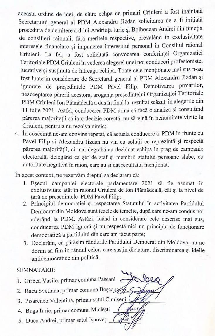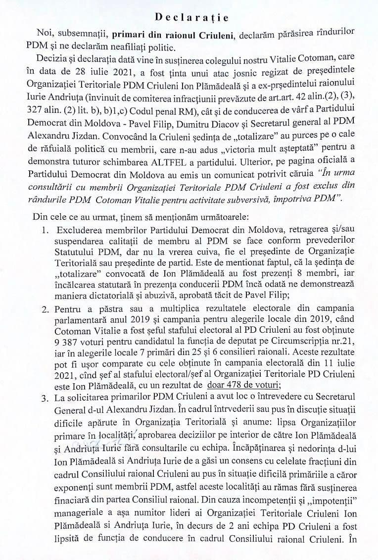 ”Declarăm că părăsim rândurile Partidului Democrat din Moldova, nu ne dorim să fim în rândul celor, care susțin dictatura, discriminarea și ideile antidemocratice din politică”, se arată în declarația primarilor.