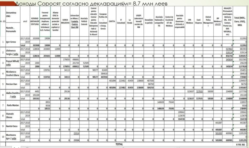 Potrivit documentelor prezentate de Țîrdea, cei mai mulți bani i-a primit deputatul PAS Dumitru Alaiba și soția acestuia – 1 568 800 lei. Pe locul doi în topul deputaților PAS finanțați de Soros este Dan Perciun – 1 391 687.