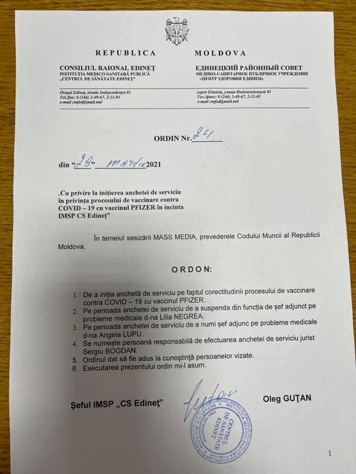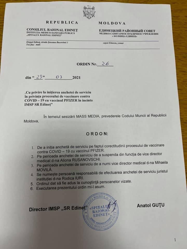 În legătură cu apariția informației, precum că unele persoane din Edineț s-ar fi vaccinat cu vaccinul Pfizer din lotul destinat persoanelor incluse în fazelor primare de vaccinare conform Planului național de imunizare, în cadrul Spitalului Raional și Centrului de Sănătate Edineț au fost inițiate anchete de serviciu, cu suspendările de rigoare, a anunțat deputatul socialist Vladimir Odnostalco, vicepreședintele Comisiei protecţie socială, sănătate şi familie din Parlament.