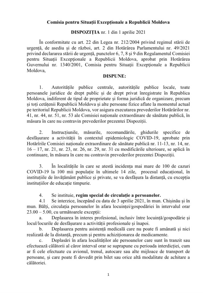 DISPOZIȚIA nr. 1 din 1 aprilie 2021 a Comisiei pentru Situații Excepționale a Republicii Moldova: