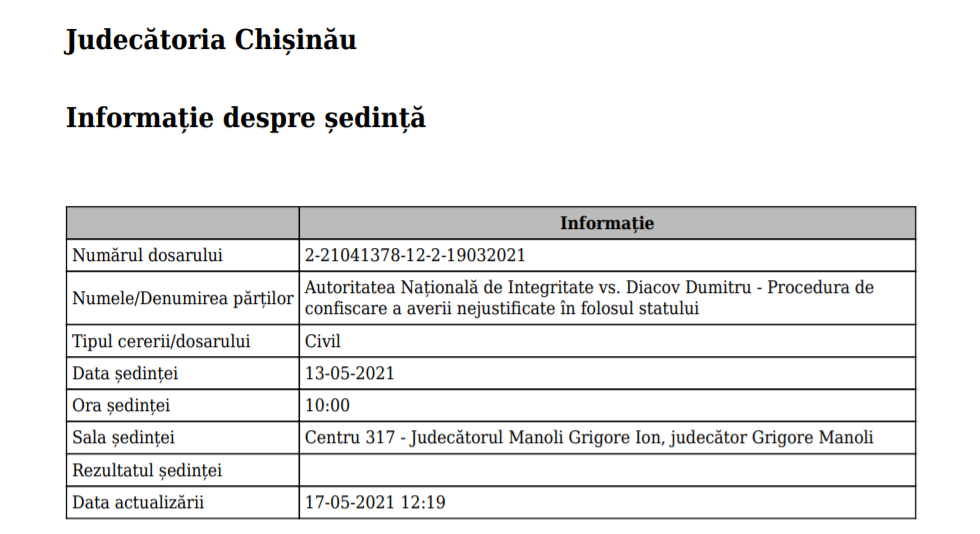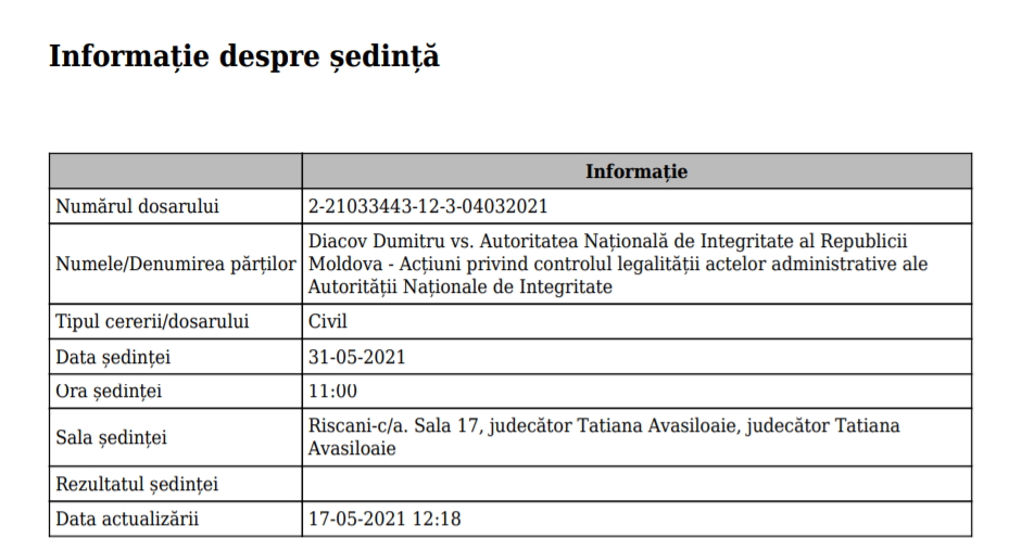 Următoarea ședință de judecată a fost stabilită pentru data de 31 mai curent, ora 11:00, și va avea loc la Judecătoria Chișinău, sediul Rîșcani. Astfel, cazul va fi examinat de judecătoarea Tatiana Avasiloaie.