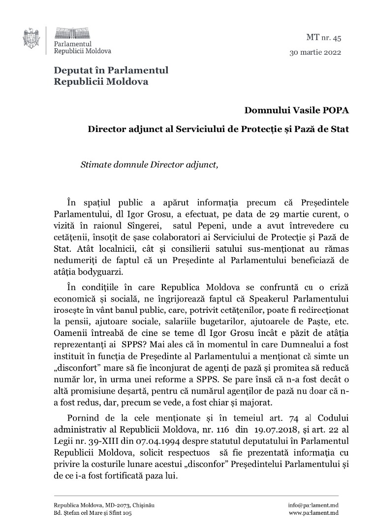 „În condițiile în care Republica Moldova se confruntă cu o criză economică și socială, ne îngrijorează faptul că speakerul Parlamentului irosește în vânt banul public, care, potrivit cetățenilor, poate fi redirecționat către pensii, ajutoare sociale, salariile bugetarilor, ajutoarele de Paște, etc. Oamenii întreabă de cine se teme dl Igor Grosu încât este păzit de atâția reprezentanți ai SPPS? Mai ales că în momentul în care dumnealui a fost instituit în funcția de președinte al Parlamentului a menționat că simte un „disconfort” mare să fie înconjurat de agenți de pază și promitea să reducă numărul lor, în urma unei reforme a SPPS. Se pare însă că n-a fost decât o altă promisiune deșartă, pentru că numărul agenților de pază nu doar că n-a fost redus, dar, precum se vede, a fost chiar și majorat”, se arată în textul interpelării.