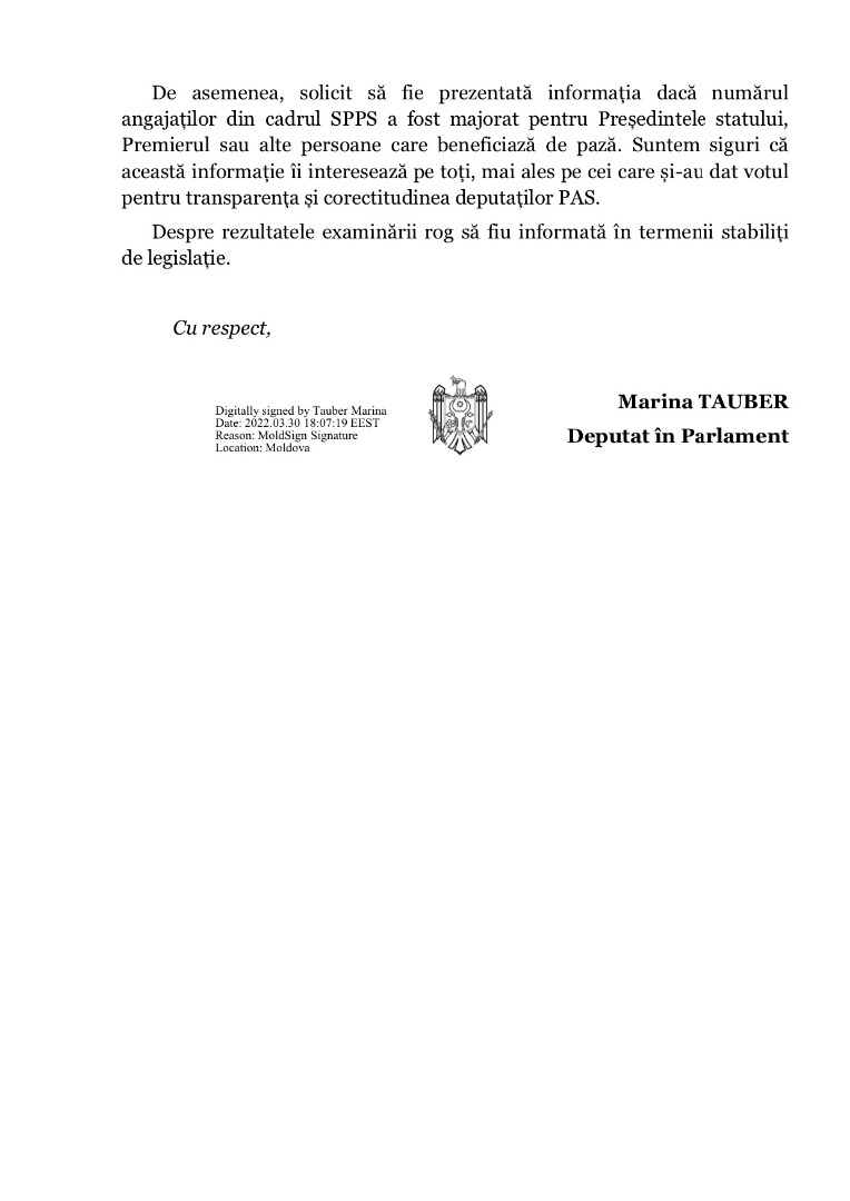 Totodată, în interpelarea sa Marina Tauber a solicitat SPPS să spună dacă numărul angajaților de pază a fost majorat pentru președintele statului, premierul sau alte persoane care beneficiază de pază.
