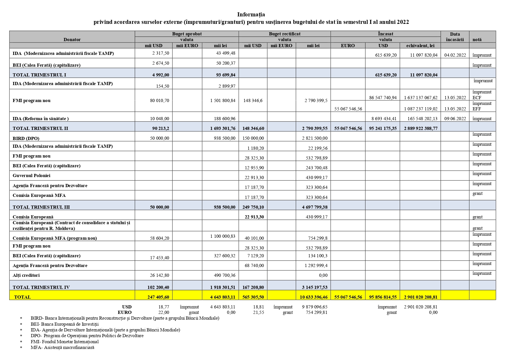 Potrivit raportului, primii bani au venit în februarie 2022, fiind un împrumut de la Asociația Internațională de Dezvoltare în mărime de 11,09 milioane de lei (615 mii $) pentru modernizarea administrării fiscale. Pe de altă parte, în primul trimestru a fost ratat împrumutul de la Banca Europeană de Investiții în mărime de 2,67 milioane de Dolari SUA pentru Calea Ferată a Moldovei.