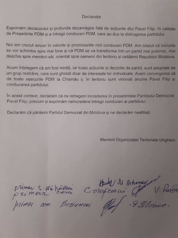 DOC // În toiul campaniei electorale, democrații din Ungheni anunță că părăsesc PDM-ul condus de Pavel Filip