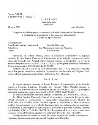 „Se admite acțiunea înaintată de Blocul Electoral al Comuniștilor și Socialiștilor împotriva Comisiei Electorale Centrale, terț Partidul Politic Partidul Acțiune și Solidaritate cu privire la anularea răspunsului din 12.06.2021 și obligarea examinării contestației depuse înregistrată din 09.06.2021. Se anulează răspunsul Comisiei Electorale Centrale din 12.06.2021. Se obligă Comisia Electorală Centrală să examineze contestația depuse de către Blocul Electoral al Comuniștilor și Socialiștilor”, se arată în decizia judecătorilor.