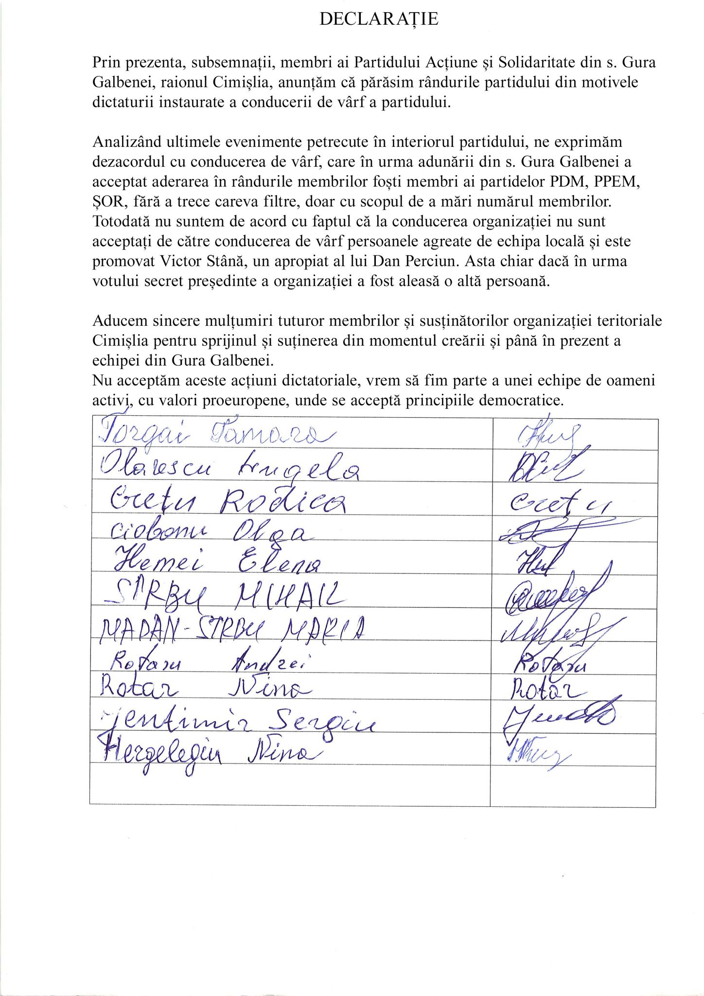 Totodată, membrii PAS din Gura Galbenei sunt nemulțumiți că la conducerea organizației locale s-ar promova o altă persoană decât cea agreată de ei. „Este promovat un apropiat al lui Dan Perciun, deși în urma votului secret președinte al organizației a fost aleasă o altă persoană”, mai spun aceștia.