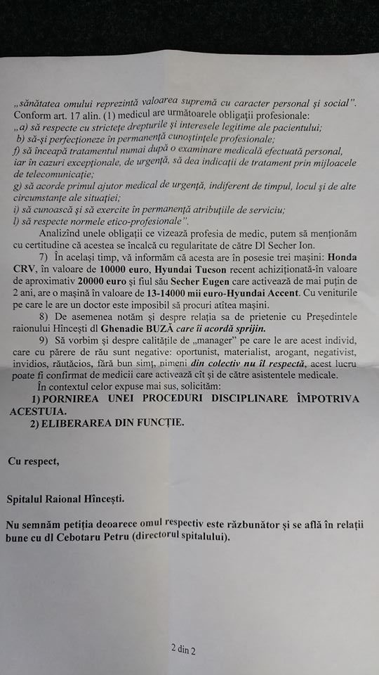 În adresare se spune că ginecologul acuzat de hărțuire sexuală este cumătrul șefului spitalului, Petru Ciubotaru, acesta este rugat să nu protejeze oamenii bolnavi care hărțuiesc sexual personalul din spital. Șeful spitalului este un factor de decizie care poate să îl demită pe Secher.