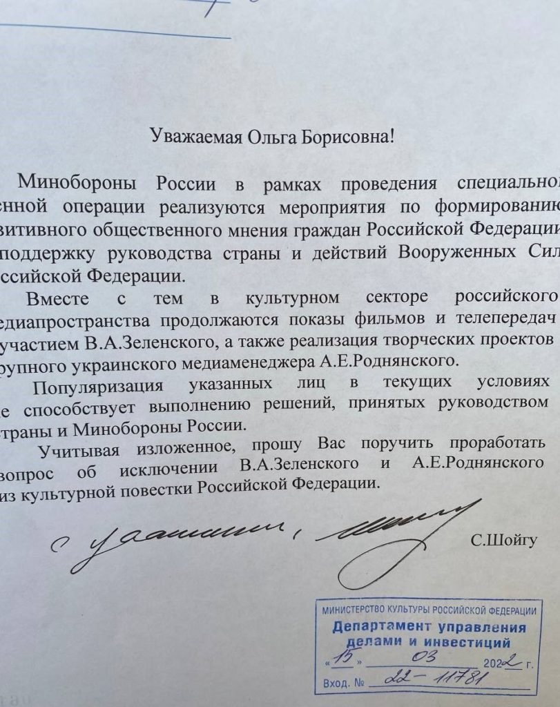 Ministrul rus al Apărării Serghei Șoigu i-a expediat ministrului Culturii Olga Liubimova o scrisoare prin care îi cere ca președintele Ucrainei Vladimir Zelenski, actor de profesie, să fie exclus din „agenda culturală”, informează Newsmaker.md