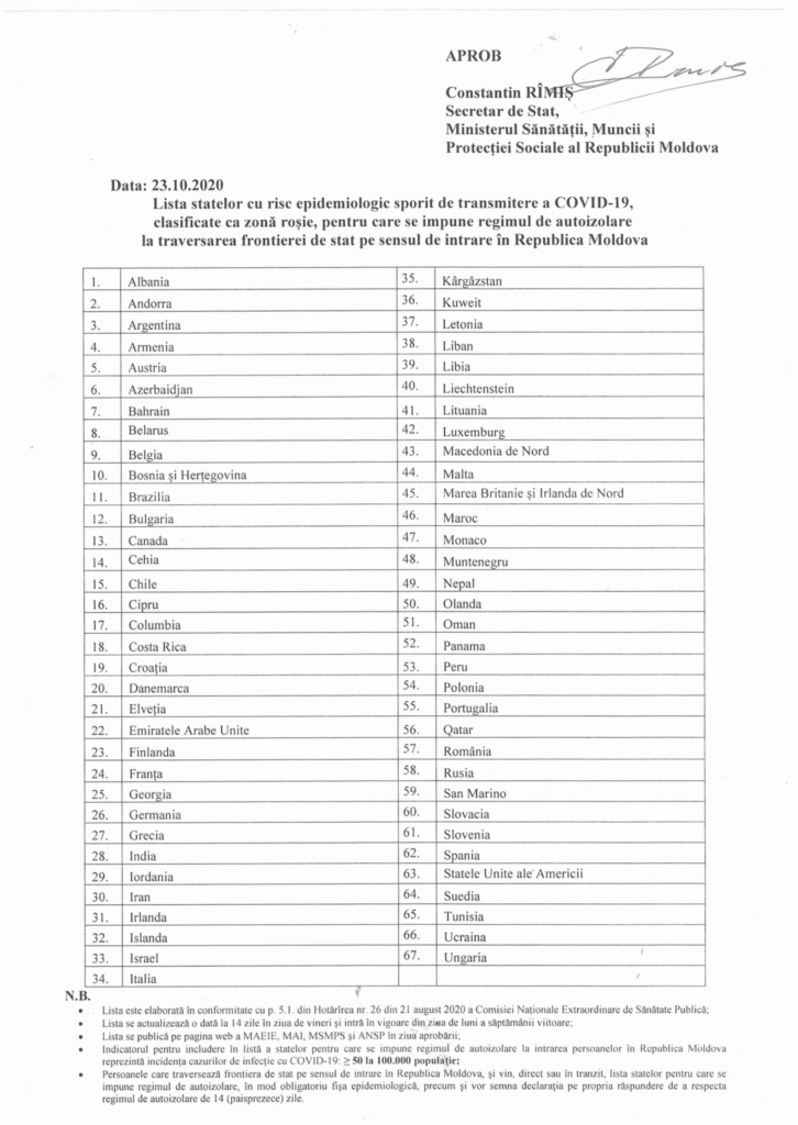 Lista este elaborată în conformitate cu pct. 5.1 din Hotărârea nr. 26 din 21 august 2020 a Comisiei Naționale Extraordinare de Sănătate Publică, se actualizează o dată la 14 zile în ziua de vineri și intră în vigoare din ziua de luni a săptămânii următoare.