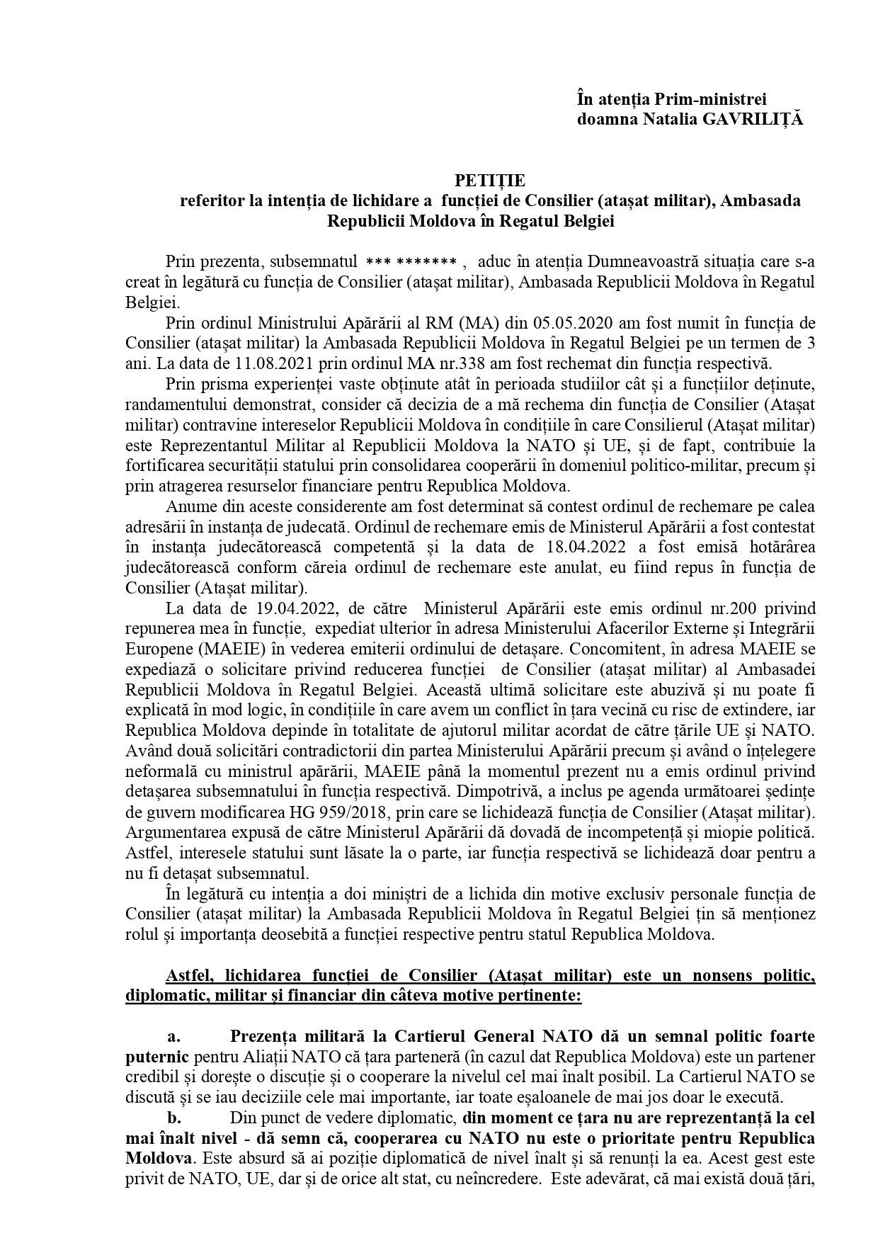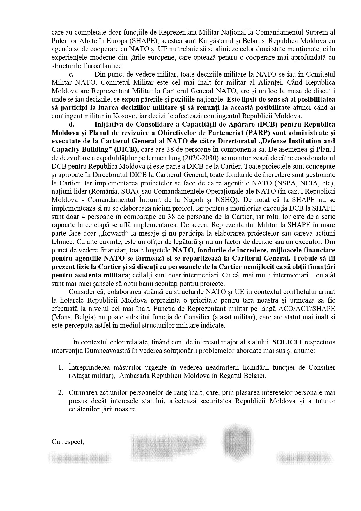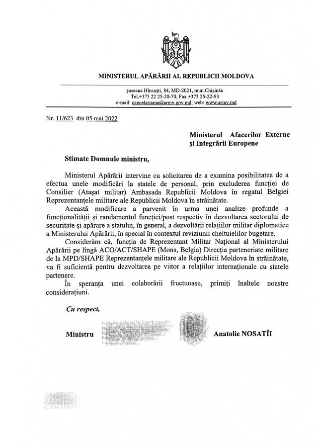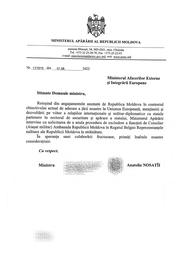 ”Reieșind din angajamentele asumate de Republica Moldova în contextul obiectivului actual de aderare a țării noastre la UE, menținerii și dezvoltării pe viitor a relațiilor internaționale și militar-diplomatice cu statele partenere în sectorul de securitate și apărare a statului, MA intervine cu solicitarea de a anula procedura de excludere a funcției de Consilier (atașat militar) la Ambasada Republicii Moldova în Regatul Belgiei, Reprezentanțelor militare ale Republicii Moldova în străinătate”, scrie Nosatîi în scrisoarea sa nr.11/1015 din 01.08.2022 către Ministerul Afacerilor Externe și Integrării Europene.