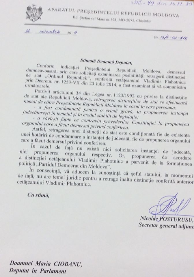 „În cazul de față nu există nici solicitarea instanței de judecată, nici propunerea organului respectiv. Or, propunerea de acordare a distincției cetățeanului Vladimir Plahotniuc a parvenit de la formațiunea Partidul Democrat. În consecință, vă aducem la cunoștință că șeful statului, la momentul de față, nu are temei juridic pentru a retrage înalta distincție conferită anterior lui Vladimir Plahotniuc”, explică secretarul general adjunct al Aparatului președintelui.