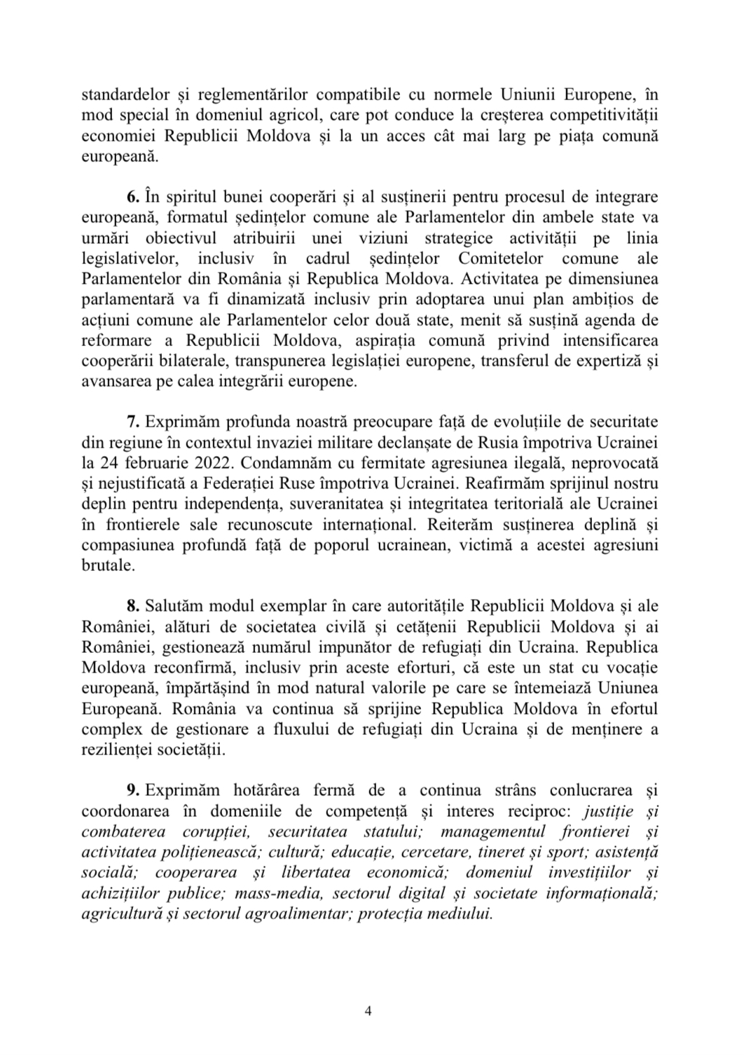 Documentul aprobat astăzi se referă și la evoluțiile de securitate din regiune. Parlamentarii exprimă profunda preocupare față de contextul regional și condamnă cu fermitate agresiunea ilegală, neprovocată și nejustificată a Federației Ruse împotriva Ucrainei. Totodată, documentul salută modul exemplar în care autoritățile de la Chișinău și București, alături de societatea civilă și cetățeni, gestionează numărul impunător de refugiați din Ucraina. ”Republica Moldova reconfirmă, inclusiv prin aceste eforturi, că este un stat cu vocație europeană, împărtășind în mod natural valorile pe care se întemeiază Uniunea Europeană”, se menționează în declarația comună a Parlamentelor de la Chișinău și București.