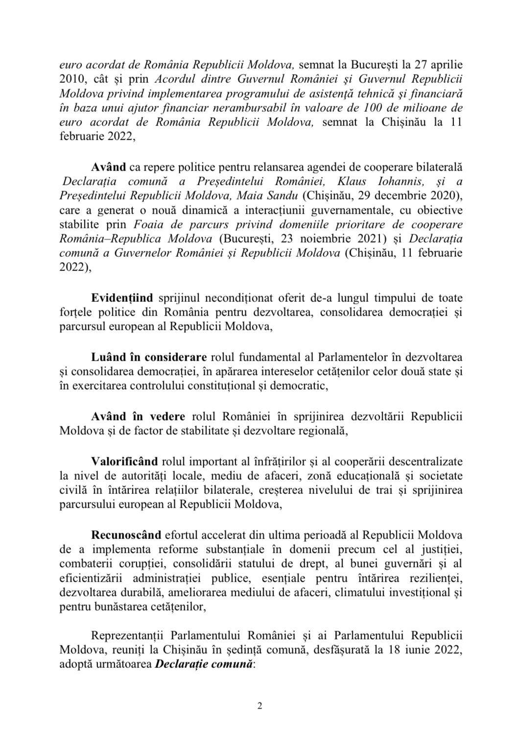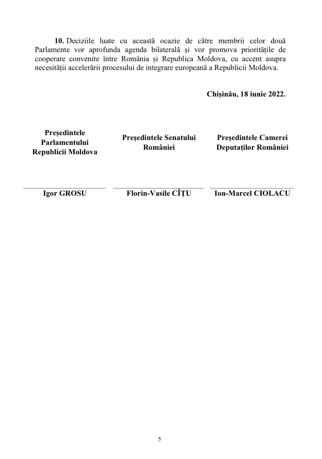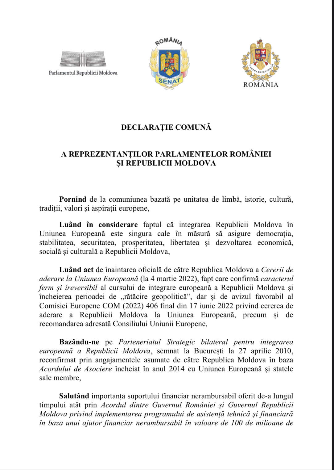 În declarație se reiterează sprijinul necondiționat oferit de-a lungul timpului de toate forțele politice din România pentru dezvoltarea, consolidarea democratică și parcursul european al Republicii Moldova. De asemenea, a fost punctat obiectivul comun privind implementarea proiectelor strategice, bilaterale, inclusiv interconectările din domeniul energiei, transporturilor și infrastructurii.