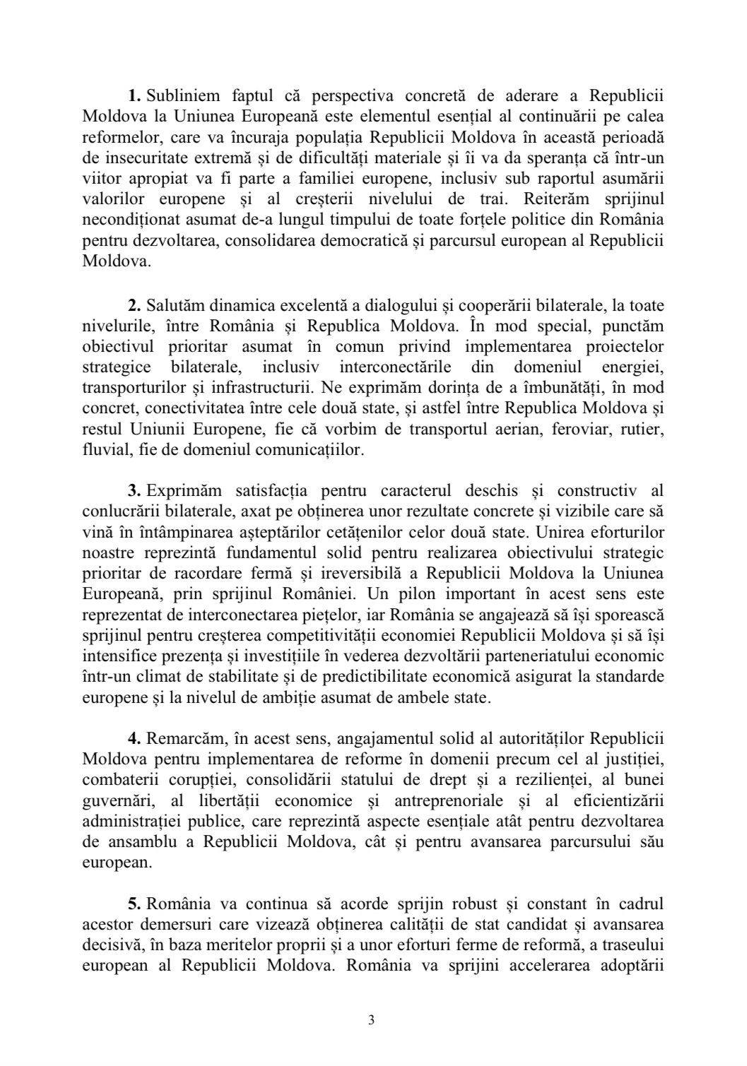 Documentul remarcă angajamentul solid al autorităților Republicii Moldova pentru implementarea de reforme în domeniile-cheie, printre care justiția, combaterea corupției, consolidarea statului de drept, buna guvernare și eficientizarea administrației publice. În declarația comună adoptată se mai menționează că România va continua să acorde sprijin constant în demersurile de obținere a calității de stat candidat și avansarea traseului european al Republicii Moldova. Totodată, România va sprijini accelerarea adoptării standardelor și reglementărilor compatibile cu normele UE, în mod special în domeniul agricol, care pot conduce la creșterea competitivității economiei Republicii Moldova și la un acces cât mai larg pe piața comună europeană.
