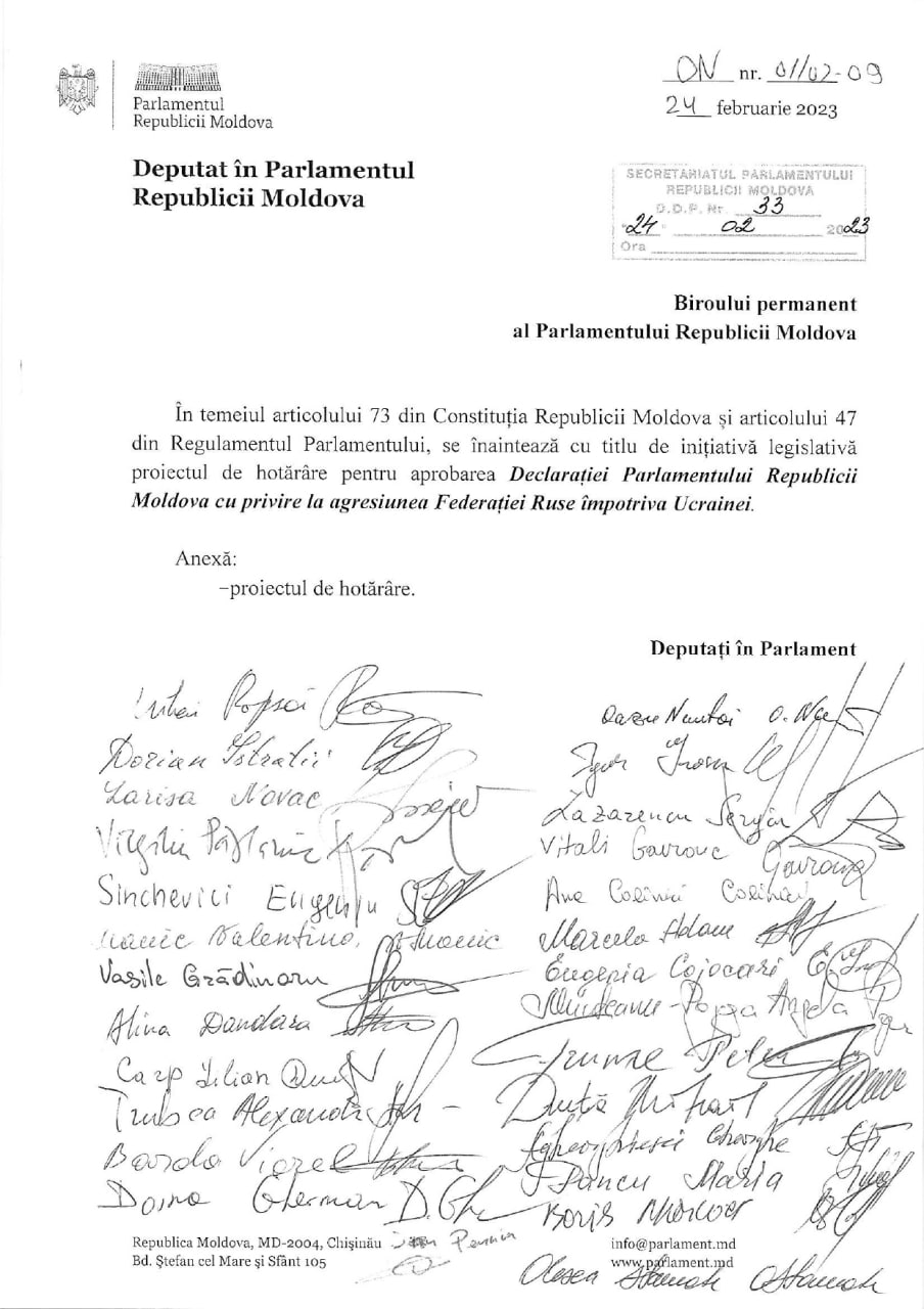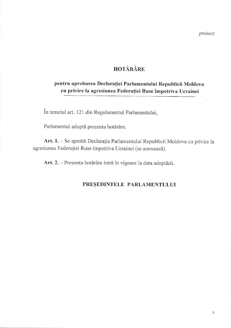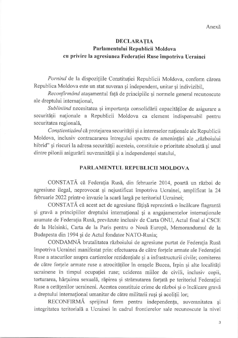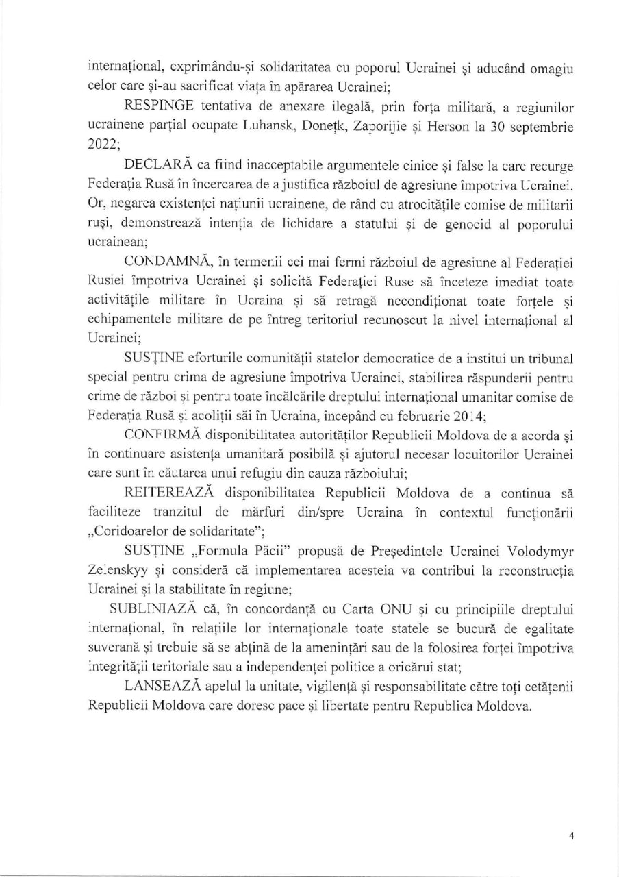 Parlamentarii solicită Federației Ruse să înceteze imediat activitățile militare în Ucraina și să retragă necondiționat toate forțele și echipamentele militare de pe întreg teritoriul recunoscut la nivel internațional al Ucrainei. În același timp, autoritățile Republicii Moldova susțin eforturile comunității statelor democratice de a institui un tribunal special pentru crima de agresiune împotriva Ucrainei, stabilirea răspunderii pentru crime de război și pentru toate încălcările dreptului internațional umanitar comise de Federația Rusă și acoliții săi în Ucraina. Documentul confirmă disponibilitatea autorităților Republicii Moldova de a acorda și în continuare asistență umanitară și ajutor locuitorilor Ucrainei care sunt în căutarea unui refugiu din cauza războiului.