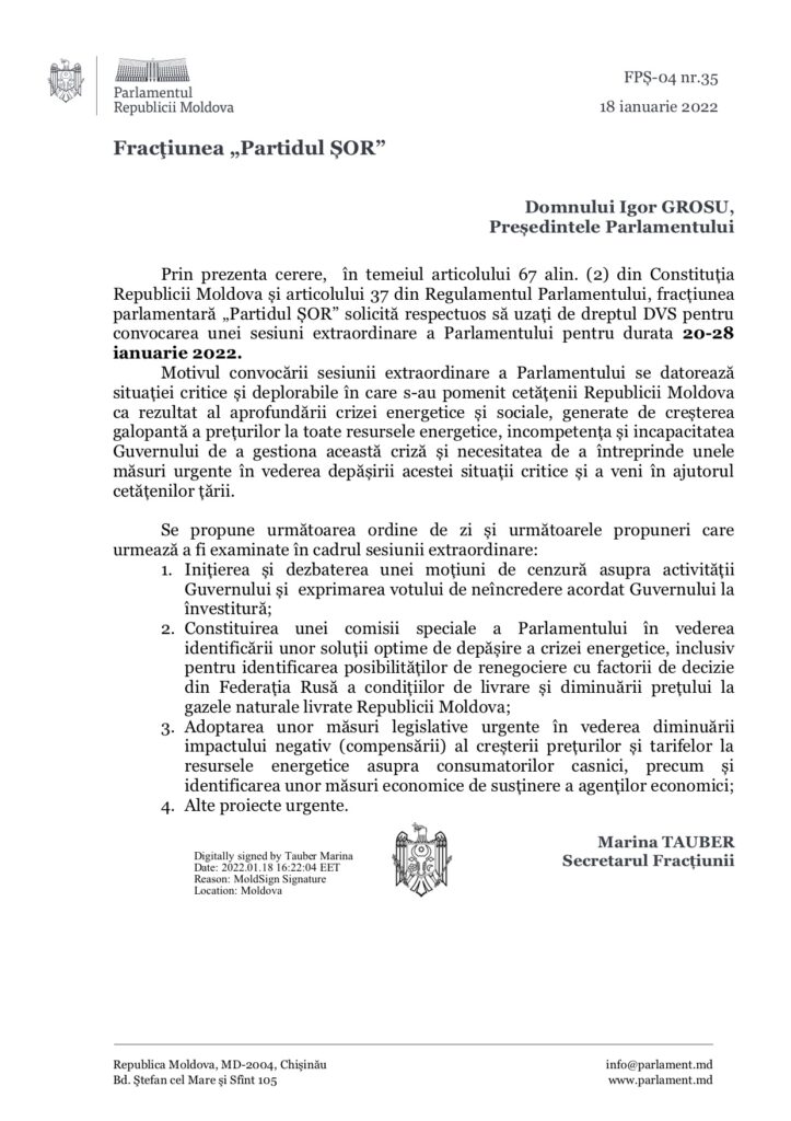 Mai exact, este vorba despre inițierea și dezbaterea unei moțiuni de cenzură asupra activității Guvernului și exprimarea votului de neîncredere acordat Guvernului la învestitură. De asemenea, fracțiunea Partidului „ȘOR” insistă asupra constituirii unei comisii speciale a Parlamentului în vederea identificării unor soluții optime de depășire a crizei energetice, inclusiv pentru identificarea posibilităților de renegociere cu factorii de decizie din Federația Rusă a condițiilor de achiziție și diminuării prețului la gazele naturale livrate Republicii Moldova. Totodată, deputații formațiunii lui Ilan Șor solicită adoptarea unor măsuri legislative urgente în vederea compensării prețurilor și tarifelor la resursele energetice asupra consumatorilor casnici, precum și identificarea unor măsuri de susținere a agenților economici.