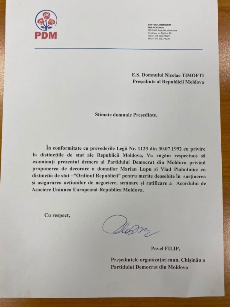 În scrisoarea lui Pavel Filip către Timofti se menționează că Vlad Plahotniuc trebuie să fie decorat cu cea mai înaltă distincție în stat „pentru merite deosebite în asigurarea acțiunilor de negociere, semnare și ratificare a Acordului de asociere cu UE”.