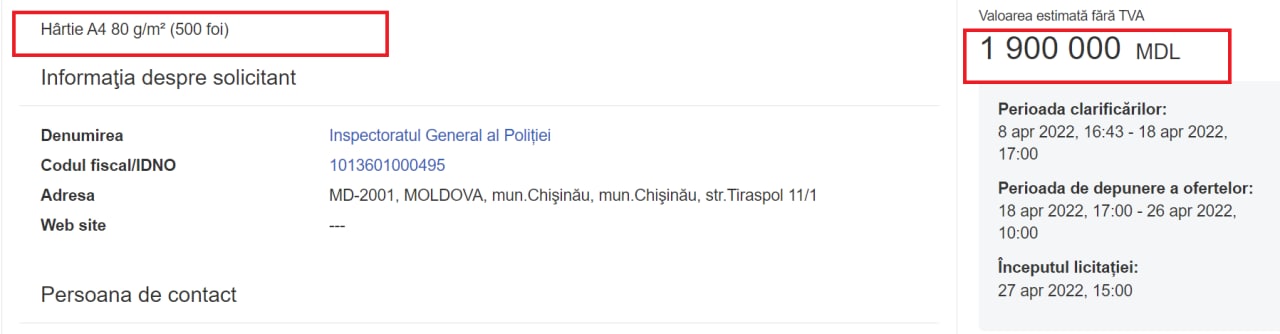 Inspectoratul General de Poliție (IGP) a anunțat licitație de 1,9 milioane de lei pentru a procura hârtie A4. Anunțul se regăsește pe site-ul oficial de achiziții publice. În total, IGP planifică să procure 25 de mii de pachete de hârtie, a câte 500 de foi fiecare, ceea ce înseamnă că poliția are nevoie de 12,5 milioane de foi.