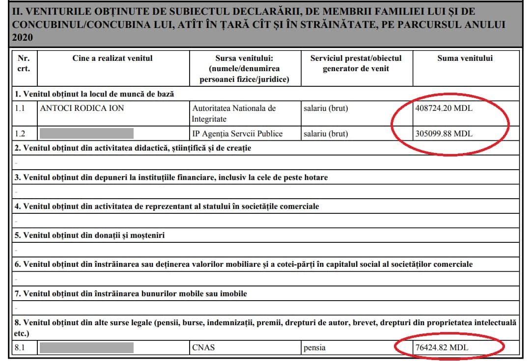 Soțul acesteia, Iurie Antoci, care este angajat la IP Agenția Servicii Publice, a primit pe parcursul anului 305 099 de lei sau peste 25 de mii de lei pe lună. Totodată, acesta a beneficiat de o pensie de peste 6300 de lei pe lună.
