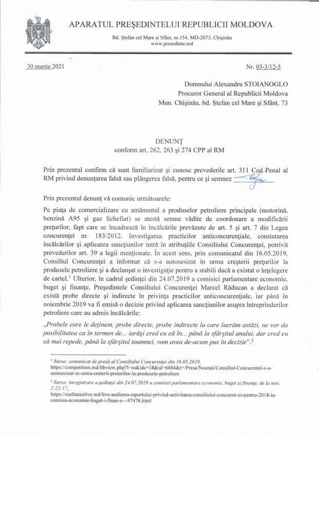 Președinția a depus un denunț la Procuratură în privința unor „înţelegeri de cartel pe piaţa de carburanţi”. Despre asta anunță consilierul prezidențial Sergiu Tofilat. Potrivit lui, companiile petroliere ar coordona prețurile, iar Consiliul Concurenței nu și-ar îndeplini atribuțiile, scrie galben.md